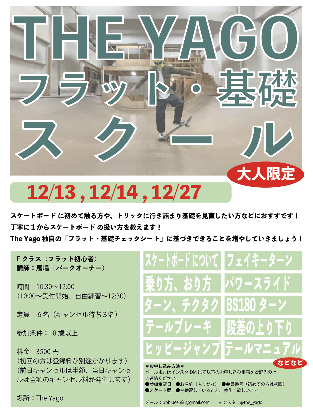 丁寧に1からスケートボード の扱い方を教えます。The Yago独自の「フラット・基礎チェックシート」に基づきできることを増やしていきましょう!