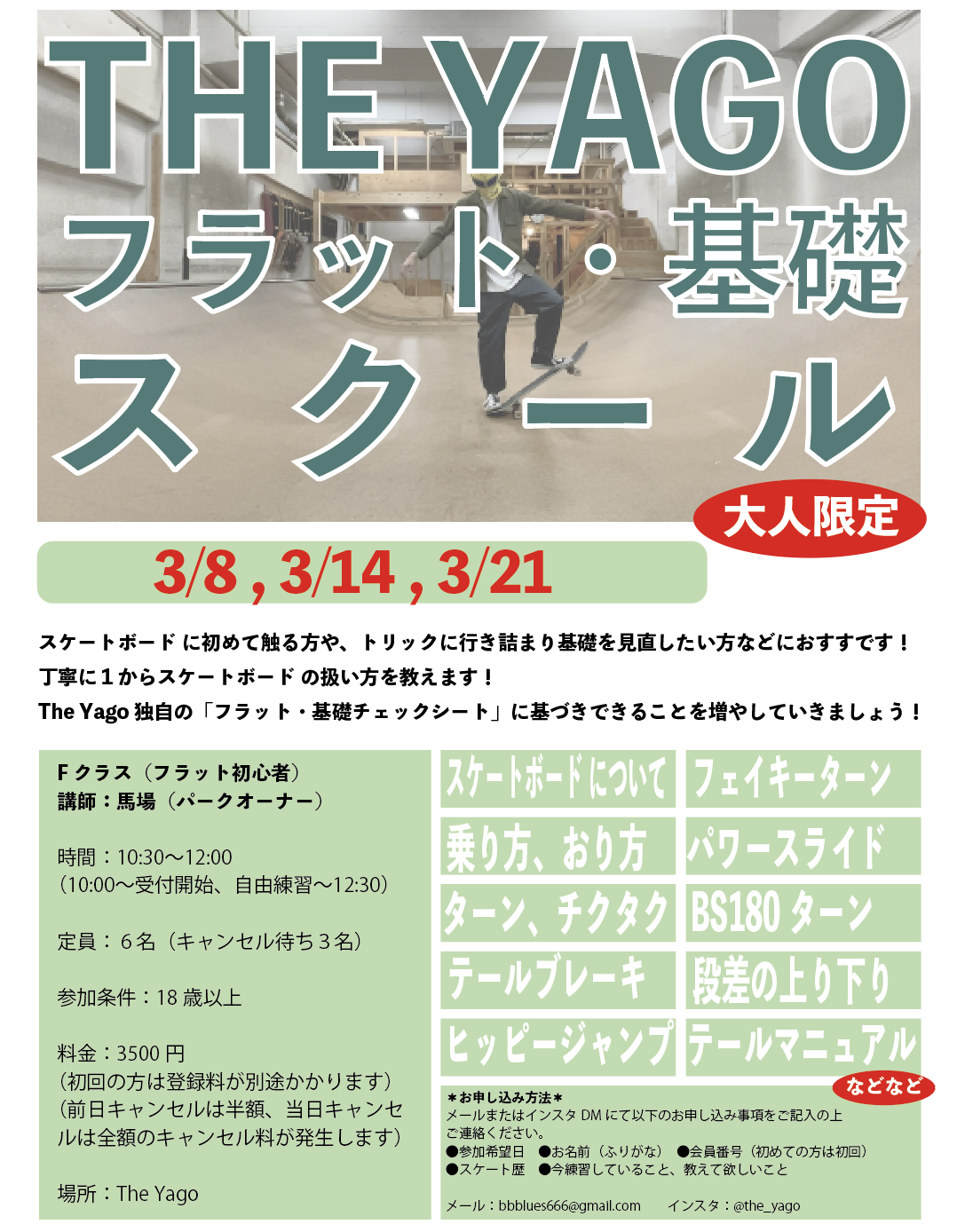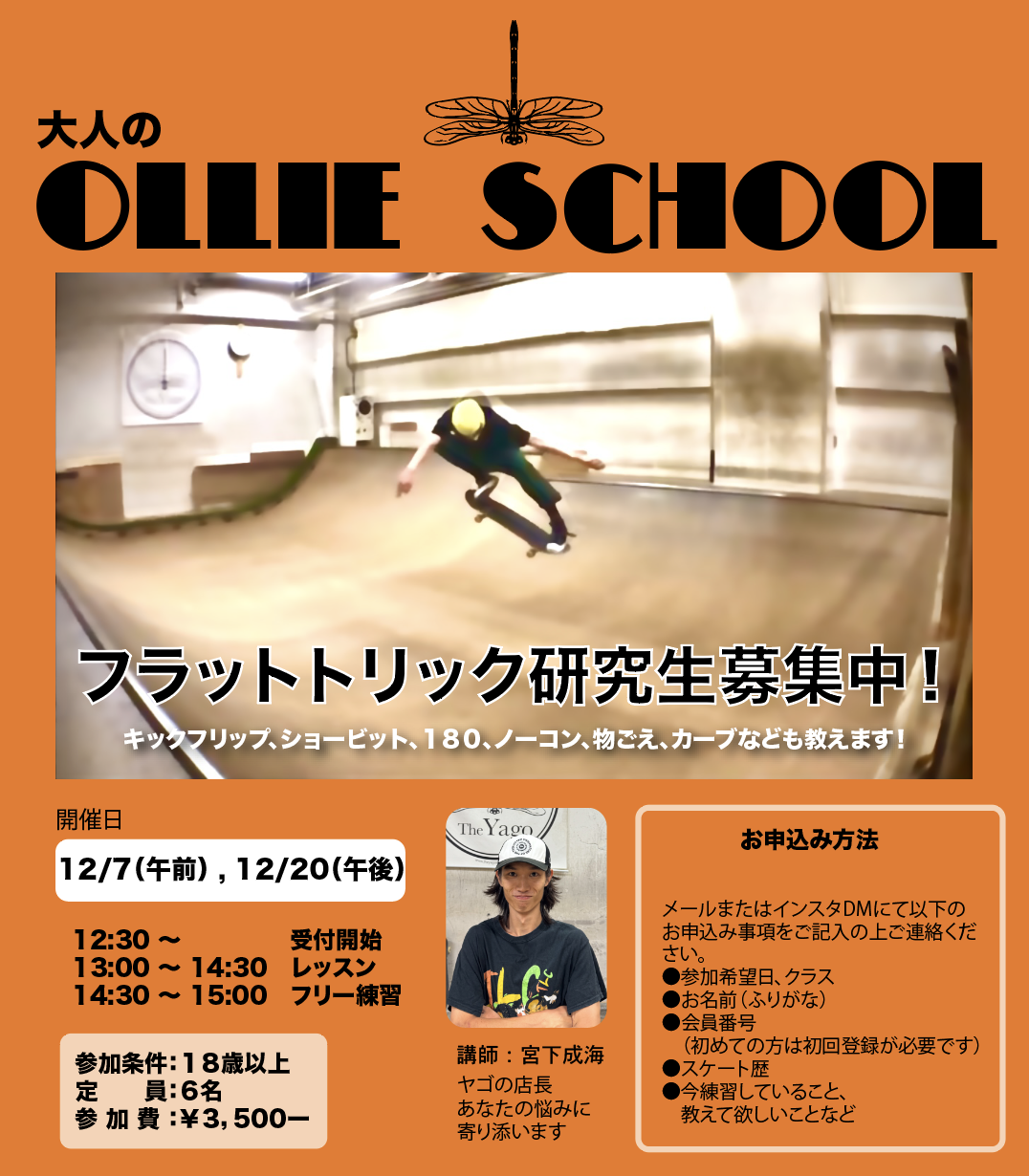 大人向けのオーリースクールはTheYagoの店長、なるくん(@c_tabe_p)が丁寧に基礎から教えます。オーリーの他、回しやカーブトリックなども教えます!